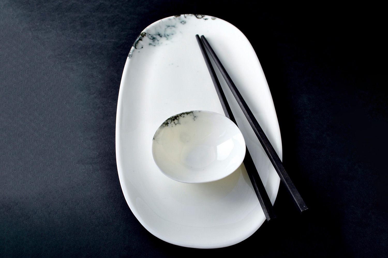 This is a sushi set consisting of a plate and bowl, both white with dark grey touches along the edges. The items are baked at 1250°C and treated with transparent glossy glaze and dark grey matte glaze.