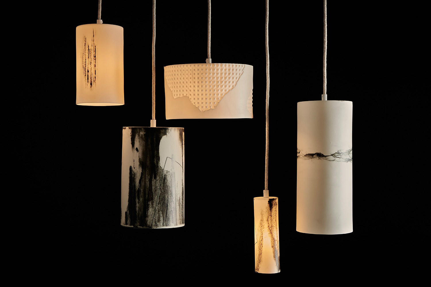 These five pendant lamps from different collections are, from left to right, BUTCH, BOBBY, ROSETTA, BOBBY and CLAIRE. The emphasis is on the texture and light transmission of the creations, always with a clear and pure design.