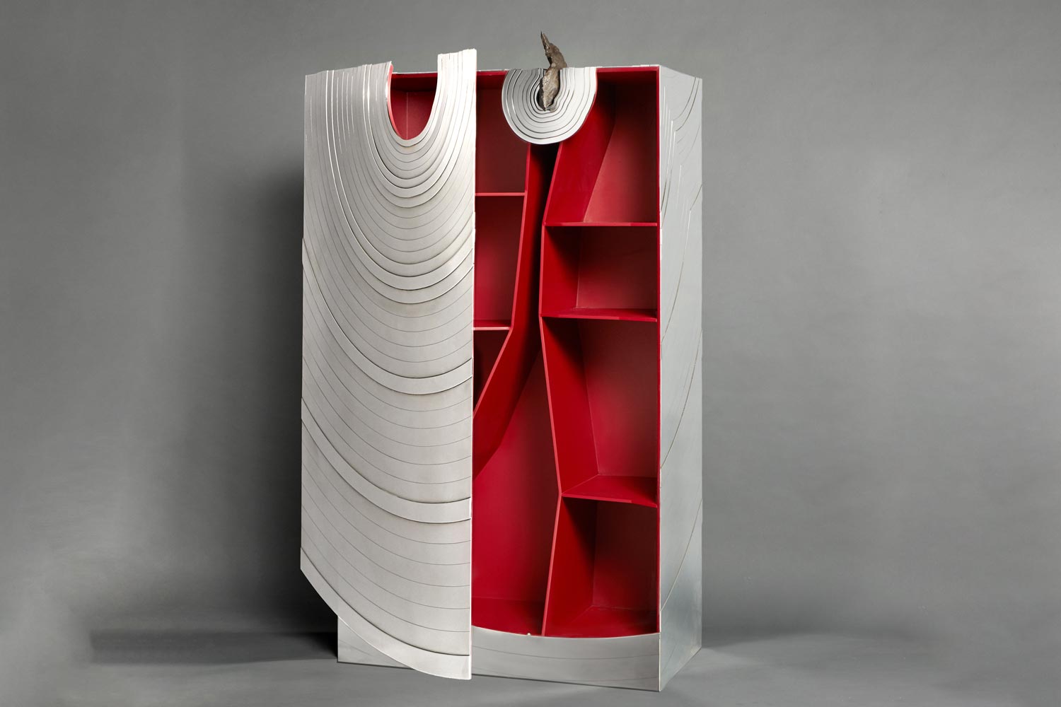 Another unique functional sculpture from Erwan Boulloud's collection, this cabinet is made from stainless steel and is incrusted with a meteorite. The red interior contrasts with the the silver stainless steel exterior. It represents a meteorite impacting and creating a wave on a mystical entity, in reference to the menhirs or to A Space Odyssey.