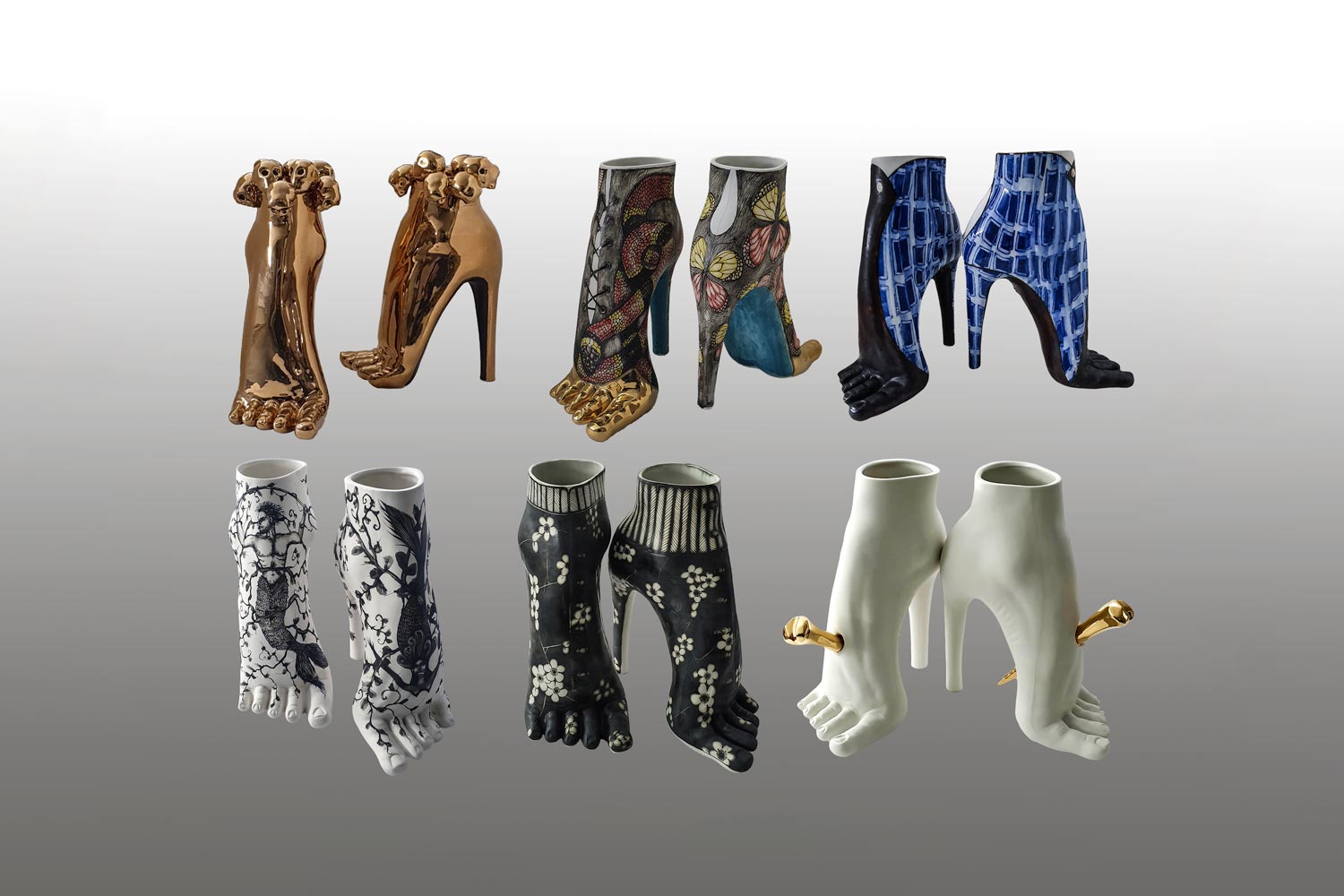 A collection of porcelain vases representing feet in heels, handmade and hand decorated with engines, oxides, glazes and 24k gold, and fired at 1260°C. The inspiration comes from anatomy and its study of the structures of the human species.