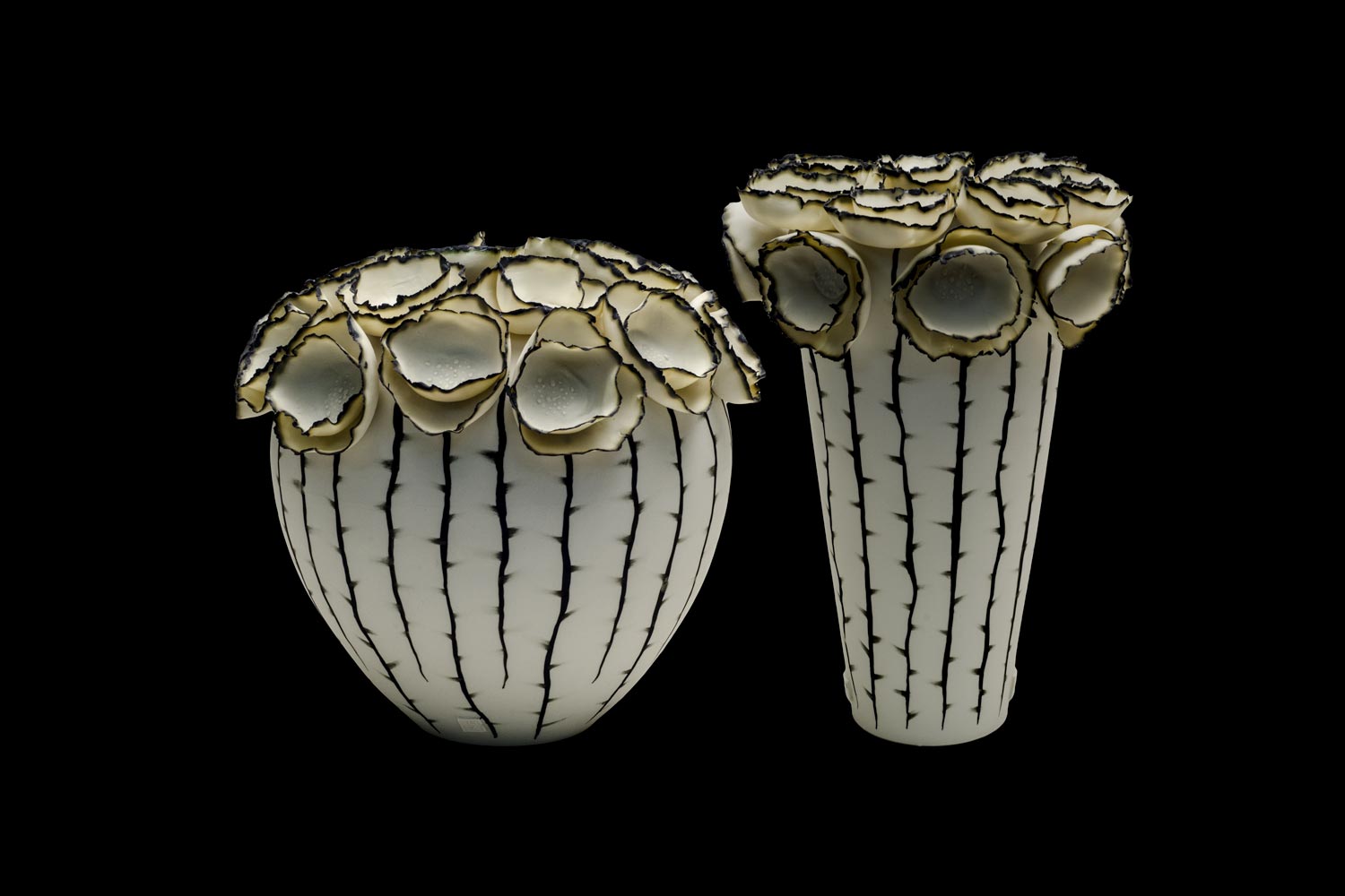 Two vases, handmade and hand painted, made of porcelain, oxides and glazes and fired at 1260°C. The surface of the vases are decorated with painted thorns, their tops with floral sculptures.
