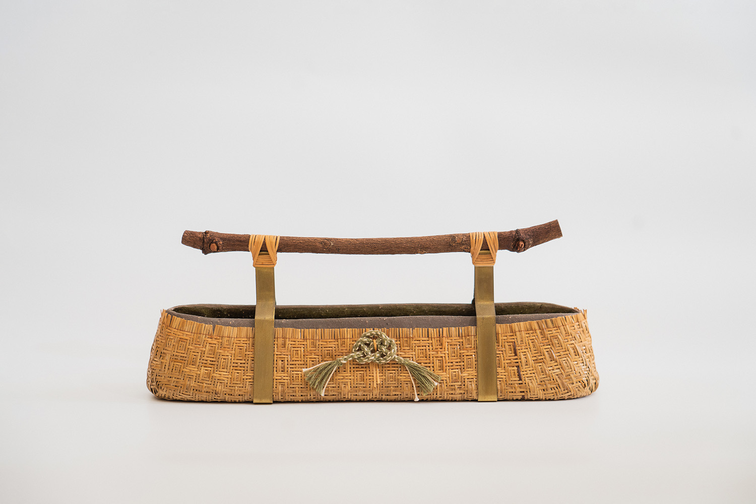Here is a hand-built pot wrapped with thin, woven natural rattan strips of 1.5mm to form a pattern. The wooden handle is a tree branch. Si Ying Ng has used brass to fit the contours of the pot and to hold the wooden handle.