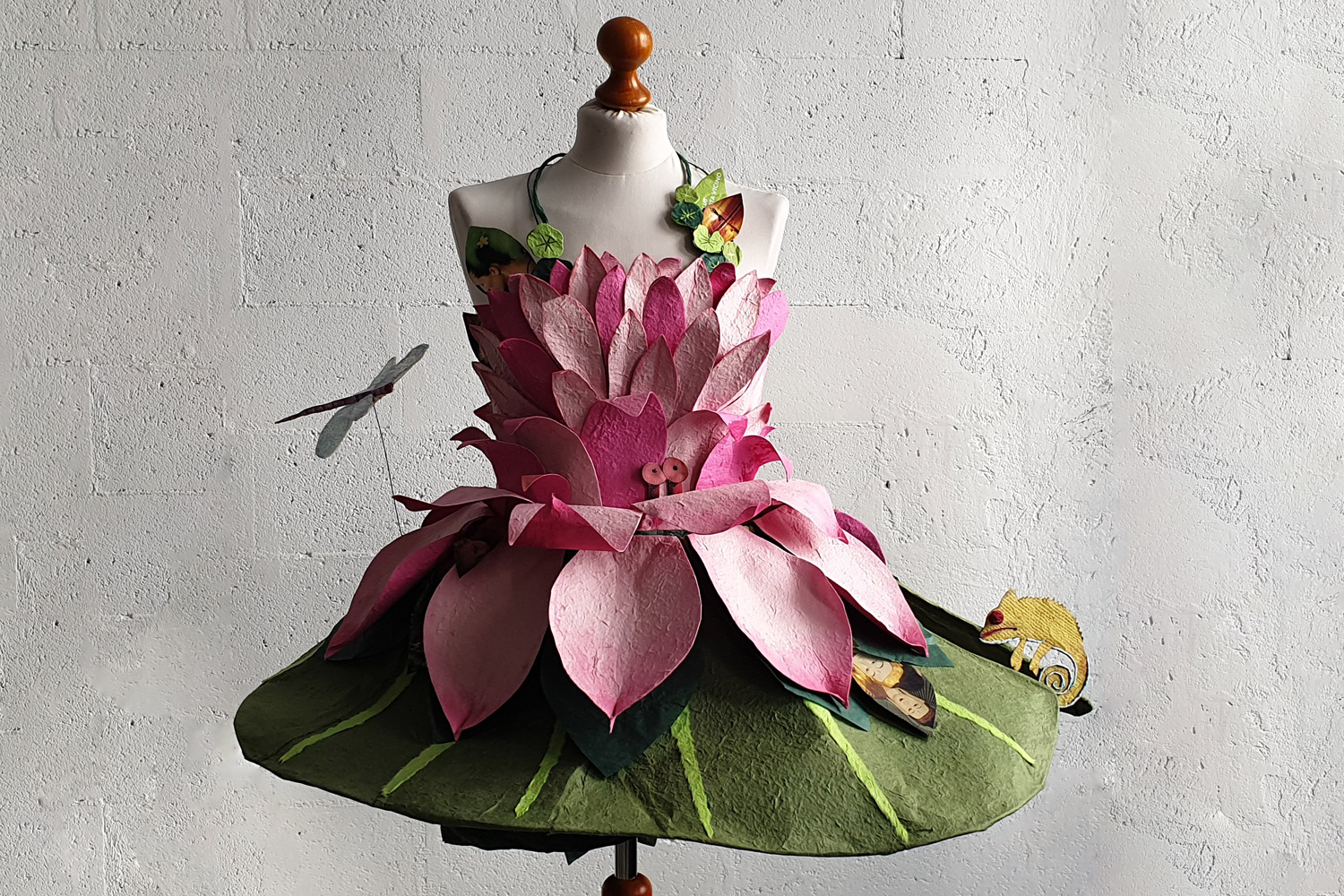 This wearable paper dress was made for a special corporate event linked with the world of travel. Ninfea is made like a water lily flower on a giant leaf skirt, decorated with little animals like a chameleon and a dragonfly. The dress is crafted from tissue paper and vinyl glue for the base covered with homemade thick coloured oriental paper. The little figures are cut out of tourism catalogues and magazines.