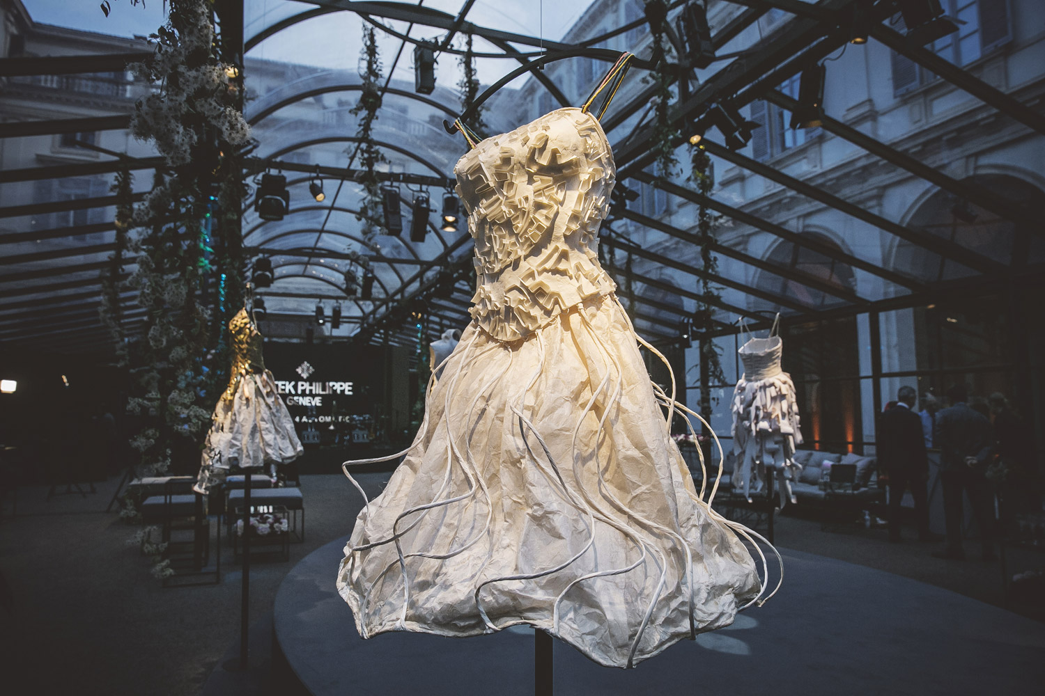The Urban Corset top is made like a water-city map, like Venice or Amsterdam with their buildings and water channels. The dress is a homage to Caterina Crepax's work as an architect, here in a luxury corporate event for Patek Philippe watches. The dress is crafted from soft silk paper, handmade thick paper, paper ribbons, tissue paper and cut paper strips.