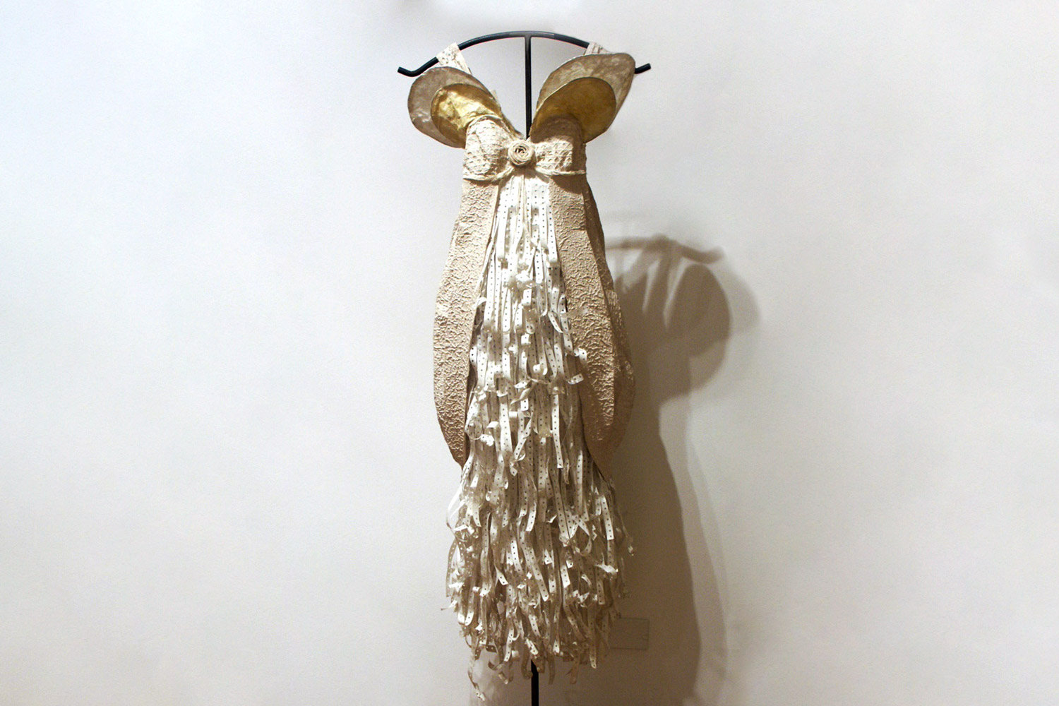 Evening Beetle is inspired by the shape of a fantasy beetle with hard armour and soft wings and a very elegant paper soft fur made with bureaucracy waste. The dress is handcrafted from various types of oriental papers, silk paper and perforated invoices.