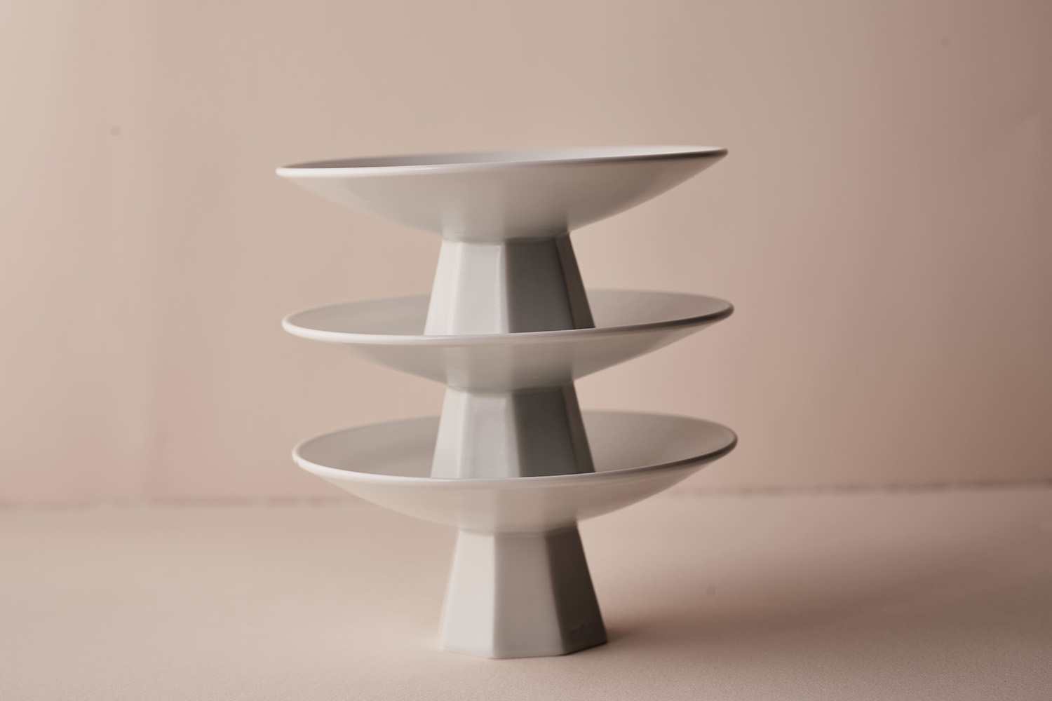 This set of plates was moulded on the pottery wheel, and then shaped by hand. The octagonal foot was made using the Myunchigi technique that removes matter by hand. Octagons are a symbol of health, wealth, and honour since ancient times in South Korea.