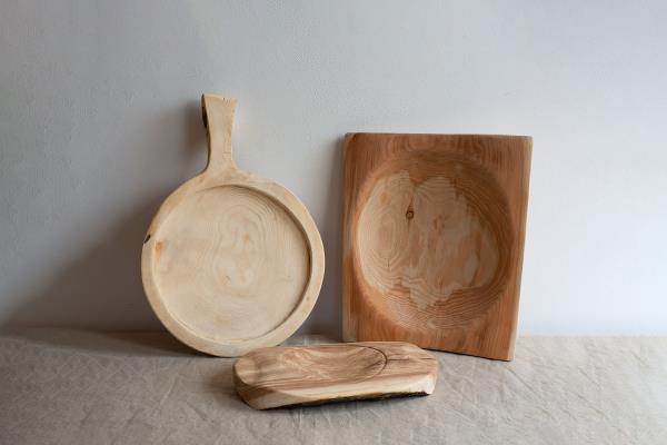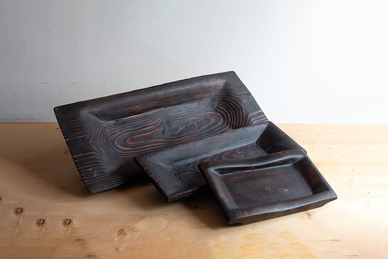 These serving trays for food or wine are made either of larch wood or arve. In both cases the wood was blackened with Yakisugi, the Japanese technique which consists of burning the surface of wood to make it stronger and more resistant.