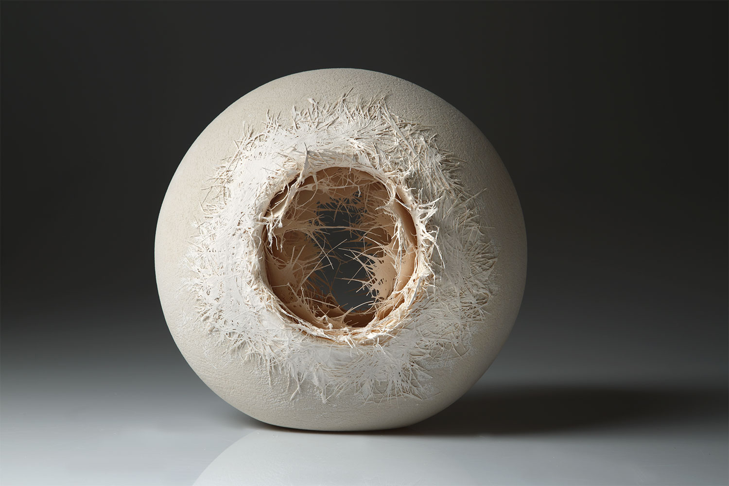 This solid round ceramic form, whose surface resembles stone, is made from white chamotte clay. A prickly mass of white porcelain mixed with fibreglass surrounds an opening in the centre and springs towards the middle of the opening. The mixture of porcelain and fibreglass seems to protect the sculpture's interior.