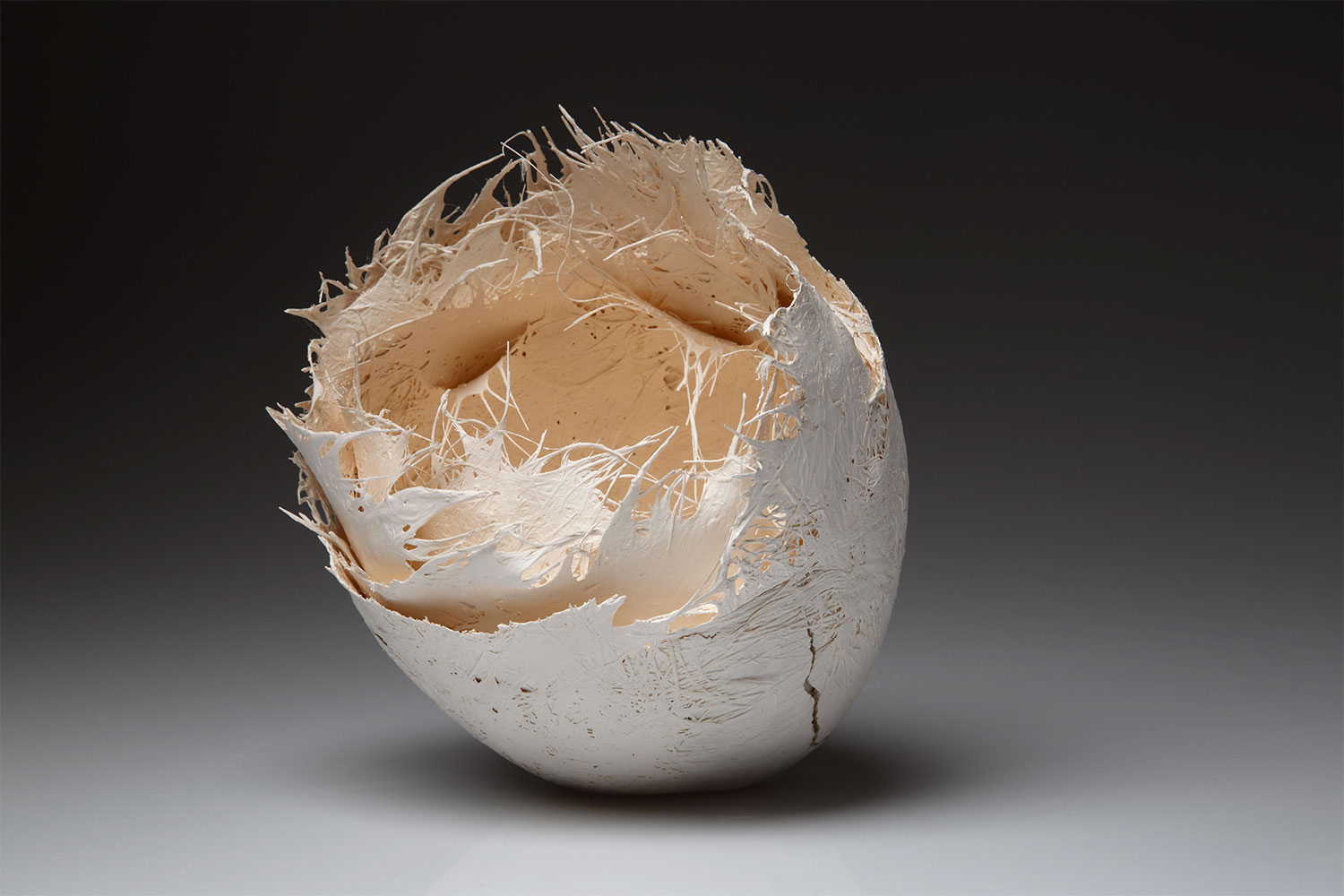 The form of this chamotte clay sculpture, part of Danijela Pičuljan's Leafing series, has been shaped like a cracked eggshell. Danijela plays with material and colour, contrasting light pink porcelain against a strong surface structure which erupts into a prickly mass of porcelain mixed with fibreglass. The piece is a reflection on the fragility of our interior, our soul.