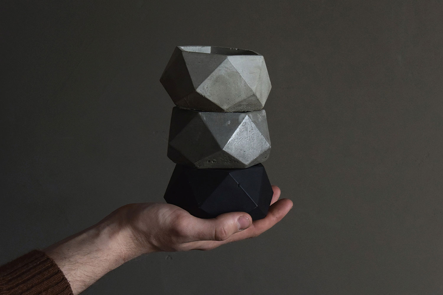 These decorative plant pots were handcrafted in concrete. They were inspired by urban pots and designed to bring both city and nature into the home.