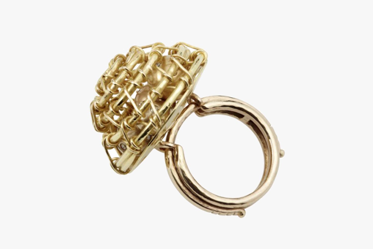 Crigoea is a ring of great craftsmanship complexity in which Donatella's artistry finds free rein and harmony. It is a tribute to childhood memories. The cage (crigoea) contains four eggs, symbolizing the four sisters (being daughters of Bruno Del Gal, owner of the Al Gallo hotel, they called them "the hens"), and thanks to a roto-translating mechanical system, it can be opened to let them out.