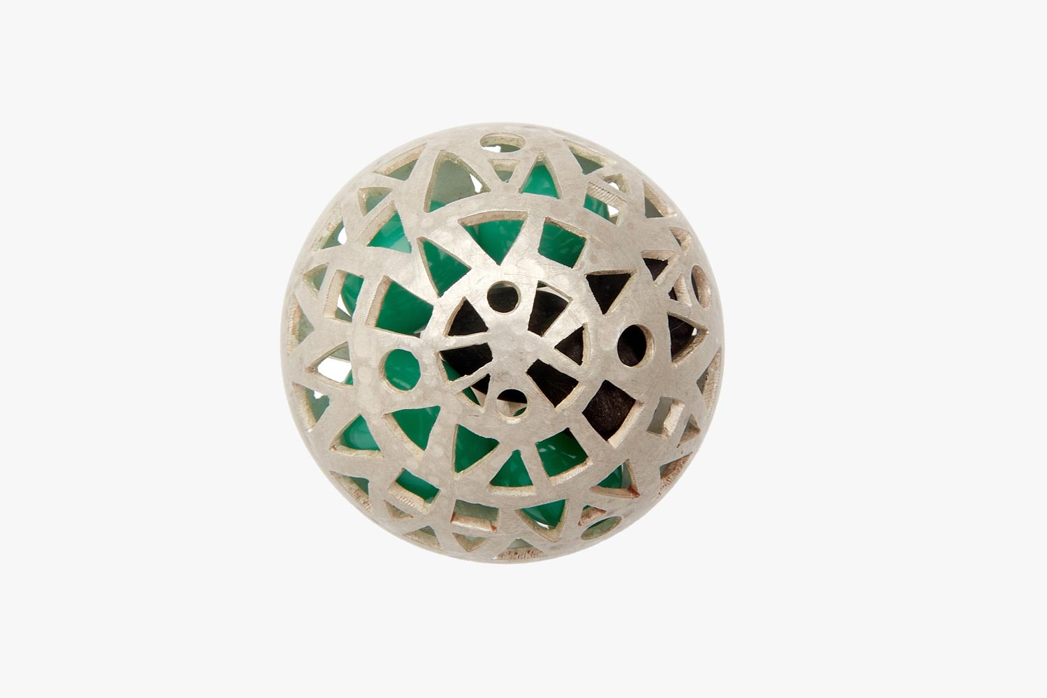 The ring resembles the dome of an astronomical observatory. The hemisphere is perforated by hand with a geometric design, allowing a glimpse of the colour of the stones contained inside. Thanks to a roto-translational mechanical system, the "dome" can be opened, allowing the wearer to change the stones inside it with others of a different colour.
