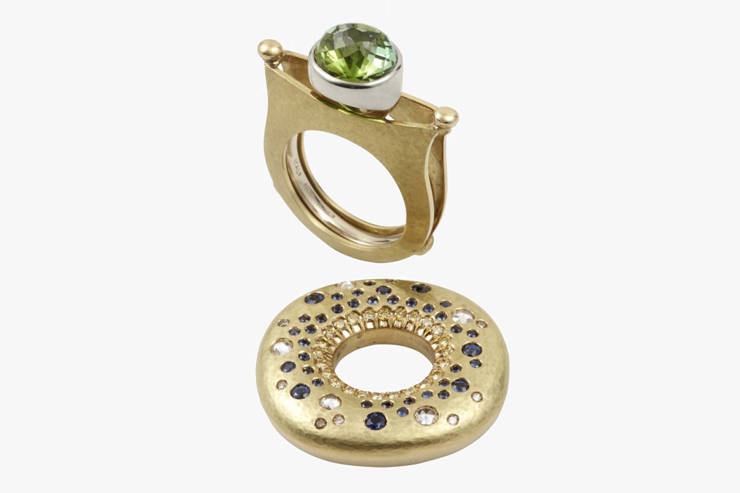 Gondola is inspired by a pair of glass candlesticks made in the 40s by Carlo Scarpa for Venini. The jewel consists of three parts: a fine ring with a stone, a pocket and an oval element. The three pieces together make up the ring. Alternatively, the upper part can be released from the stem and become a pendant or, with the addition of a button, a bracelet while the ring with the stone becomes a very fine engagement ring.