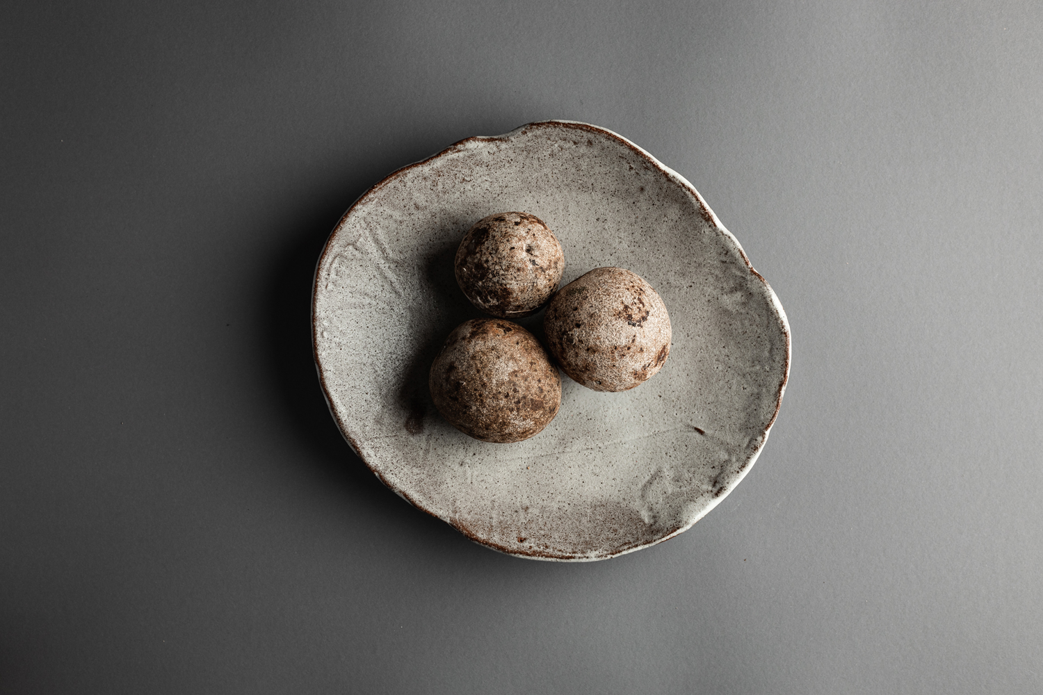 This handmade ceramic plate is made of red clay with added glaze. It has a round shape with touches of roughness on the edges.