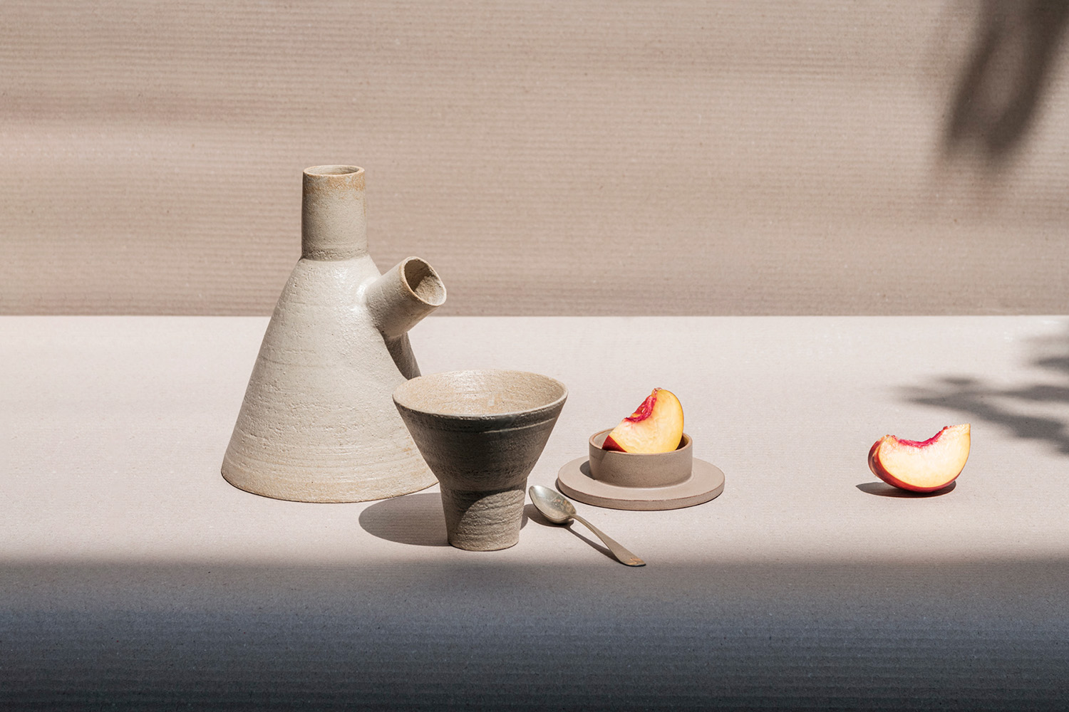 This jug and cup were thrown at the wheel and are here shown in sepia.