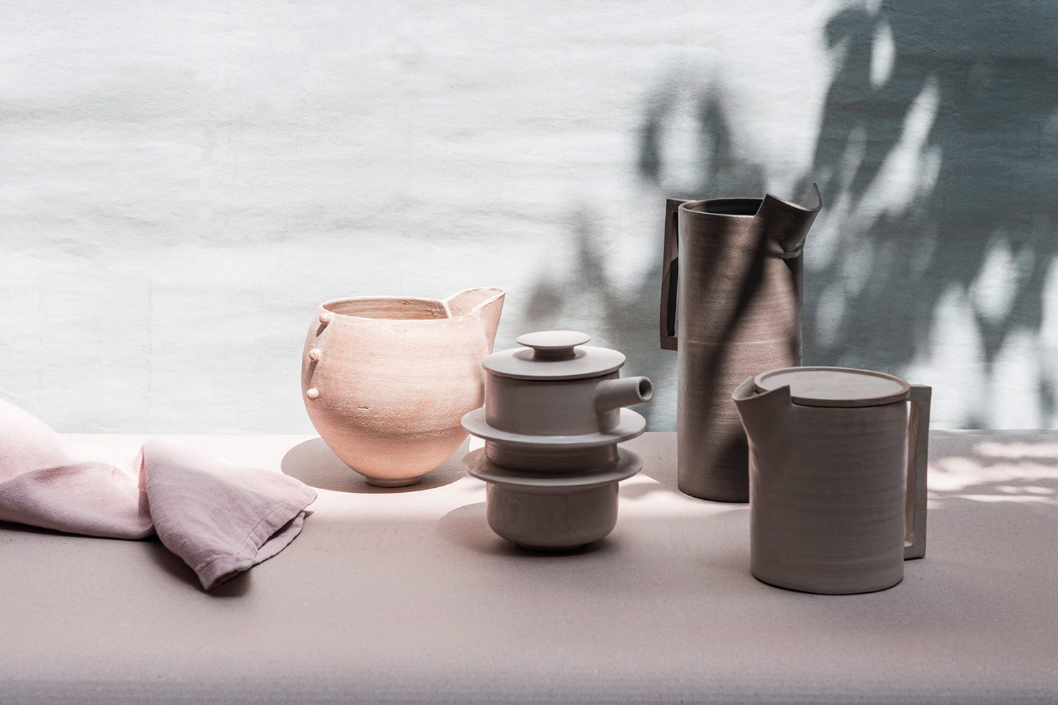 These tableware items were all made at the wheel. From the left: the Sunafè jug, Ventidue teapot, Rosa Morada jug and Rosa Morada teapot.
