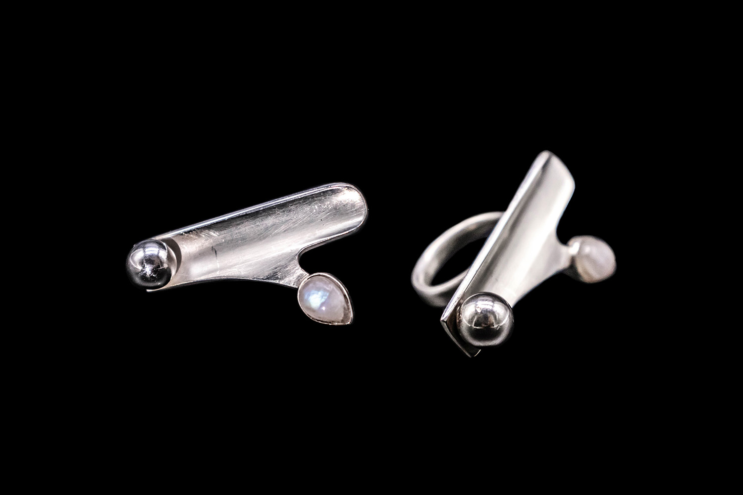 This ring was made with an antique silver spoon used to handle and serve shrimp (shellfish). At one end there is a 950 silver sphere forming a seed. At the other end there is a leaf formed by a moonstone set in 950 silver.