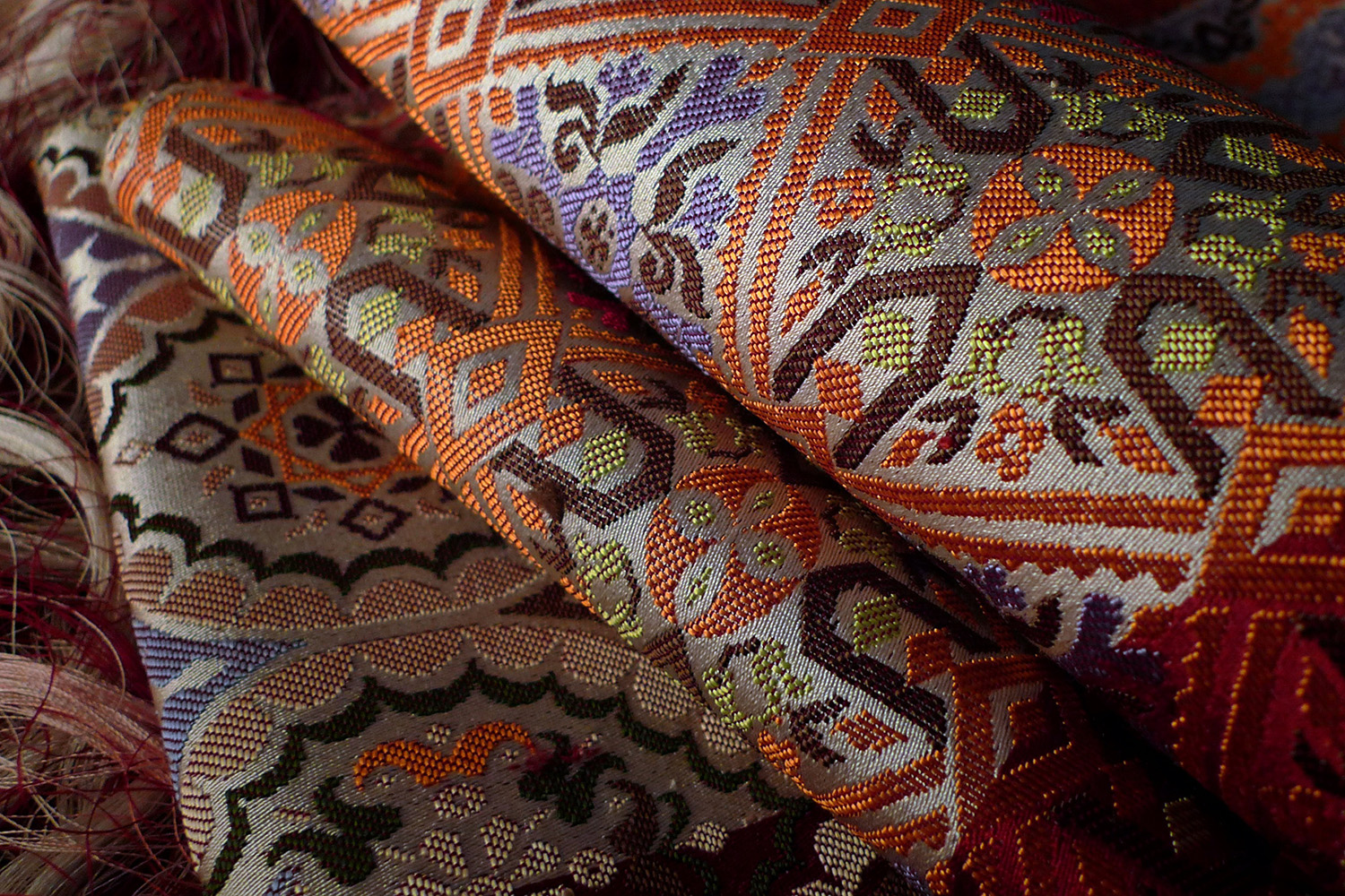 This piece of fabric is the exact reproduction of a very sophisticated and complicated 14th-century pattern. The lines intertwine in a decorative maze. The colours are also faithful to the original. Colours that were fashionable in those days were red, yellow and the Islam green. As representing human figures was forbidden by Islam, geometric shapes flourished.