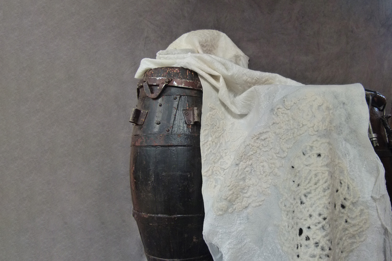 This felt shawl piece is created from a single layer of hand felted fleece. The techniques used are nuno felting (flat weaves worked together with the fleece), and spider felting (spun wool that is blended and felted together).