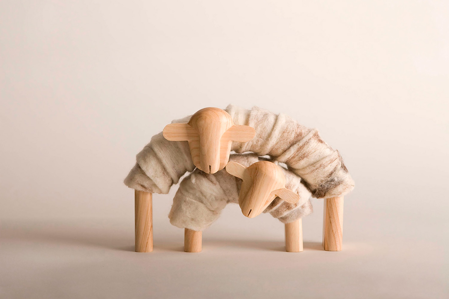 This is a small-scale decorative sculptural object. The set consists of two separate pieces that formally approximate semicircular arches. The mother sheep wraps as in an embrace to her lamb. The piece is made of carved and assembled wood. The wool body is made of kneaded felt that wraps around the wood. The object has the natural colour of the materials used and is part of the Paisajes Rurales (Rural landscapes) series that celebrates the animals that characterise Uruguayan rural folklore.