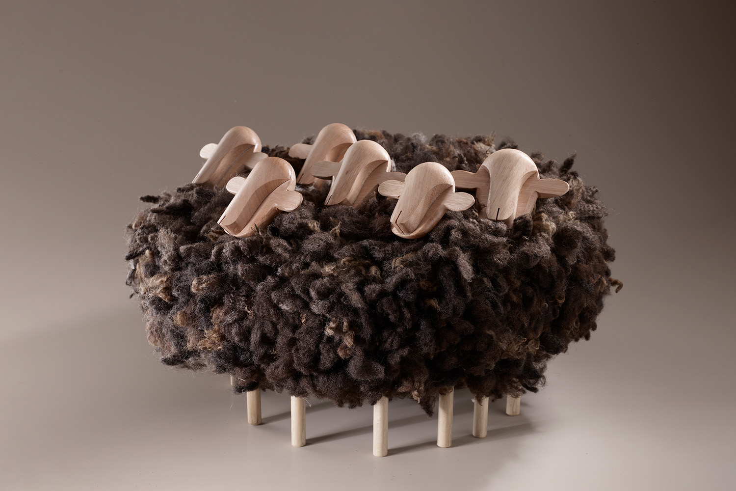 This is a decorative sculptural object, carved and assembled. The unit's shape is inscribed in a flat cylinder. Many sheep's heads are visible in the cloud that gives its shape to the whole. The wool applied is the natural fleece of freshly sheared sheep in its natural colour. The piece is a symbol of rural landscapes in Uruguay.