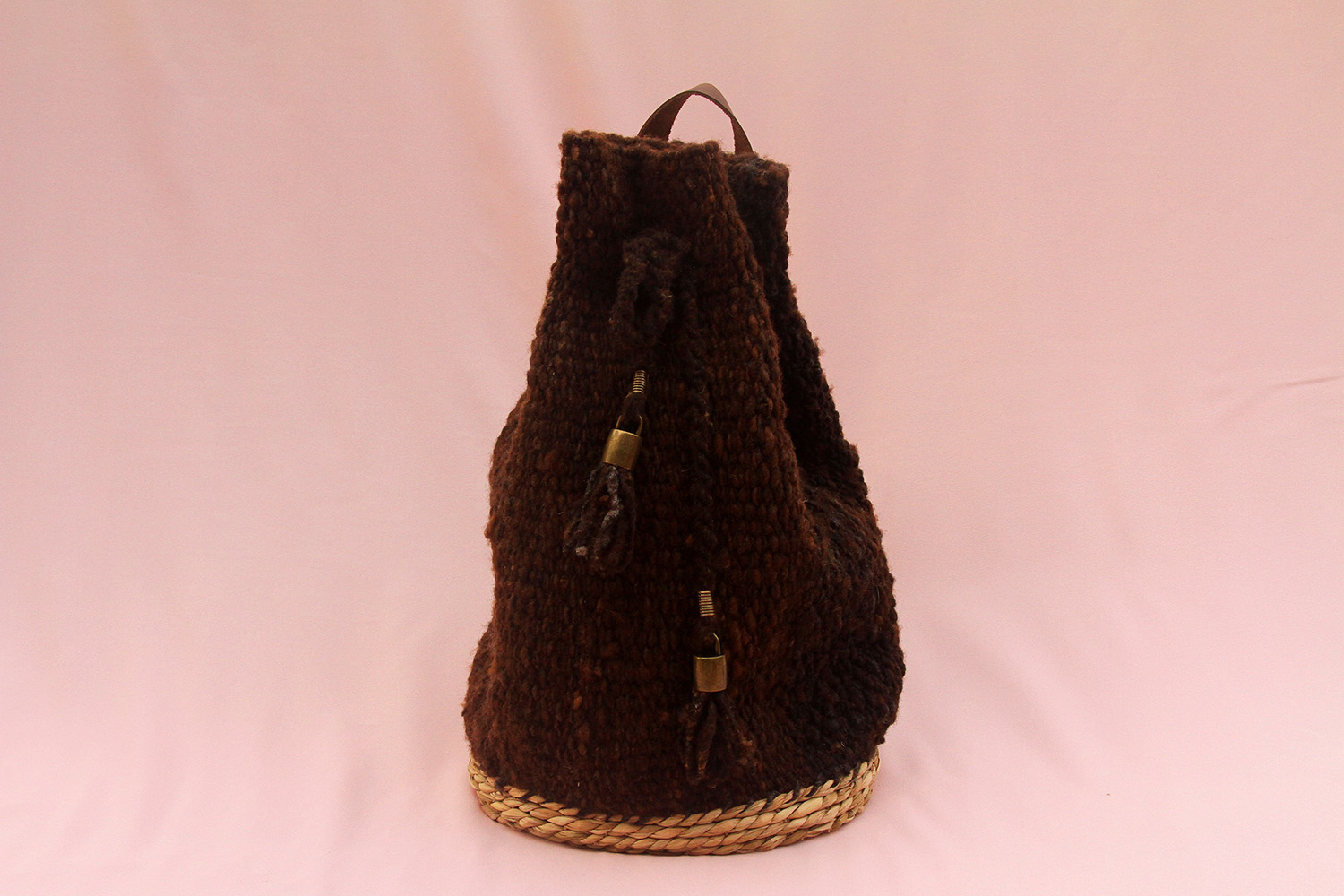 This backpack has a cylindrical body. It is made of rustic wool, hand-spun and woven on the loom with a basketry base in totora fibre. The backpack has two straps and a waxed leather handle. The backpack comes in three colors of natural undyed wool: white, gray and chocolate.
