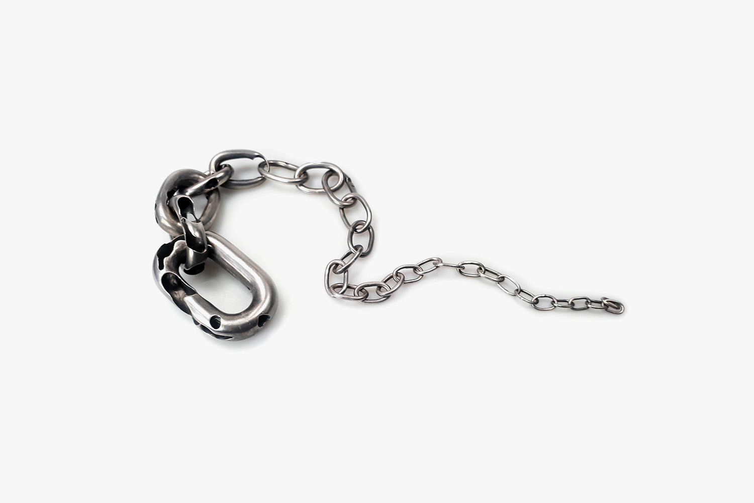 In this necklace the links are carved from wax and then cast in silver. The five biggest links are all hollow assembled and the smaller links are assembled from solid silver wire.