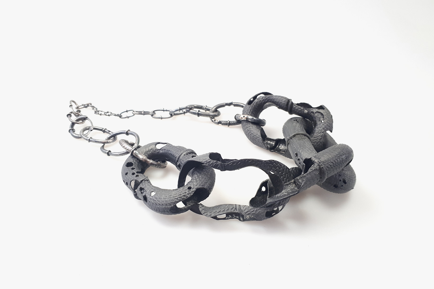 This necklace belongs to the Somber collection. It has deteriorated, carved resin links as well as assembled silver links, and a clasp in oxidised silver.