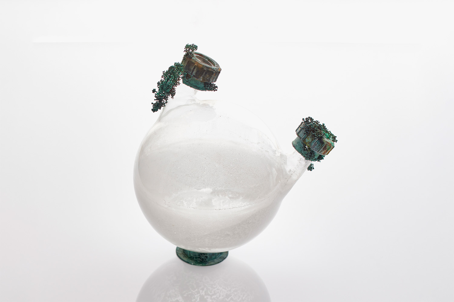 This is a water sculpture from the Aquatopia collection. Moss is assembled on plumbing parts, over a glass sphere with two openings which sport electroformed copper. The copper is green patinated, and the glass is patinated with white limescale.