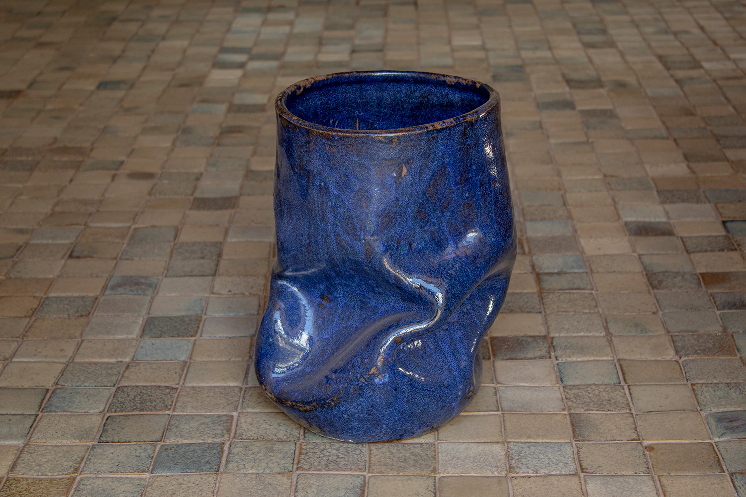 This decorative vase is wheel-thrown using terracotta clay. It is then squeezed and squashed by hand to give it a battered tin effect. The vase is finished with a homemade, roughly crushed cobalt glaze. This gives it the vase different cobalt blue hues.