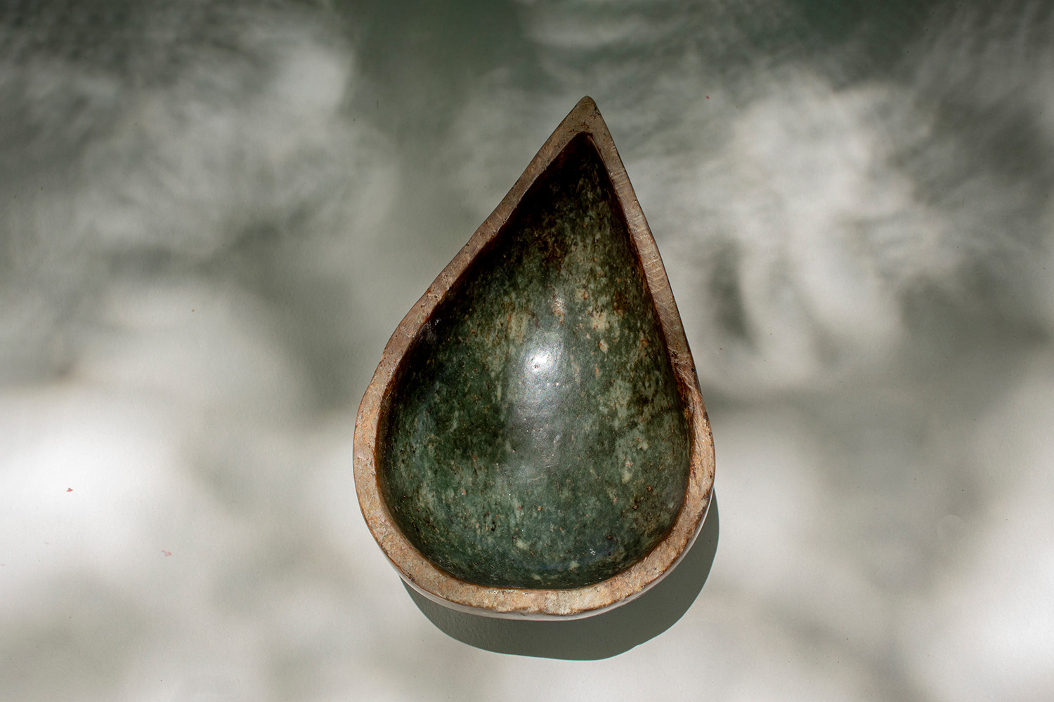 This bowl is hand carved from natural opal stone into a raindrop shape. The bowl is polished, and the edge is left raw for contrast. The stone is a mottled green colour, giving the bowl a marbled appearance.