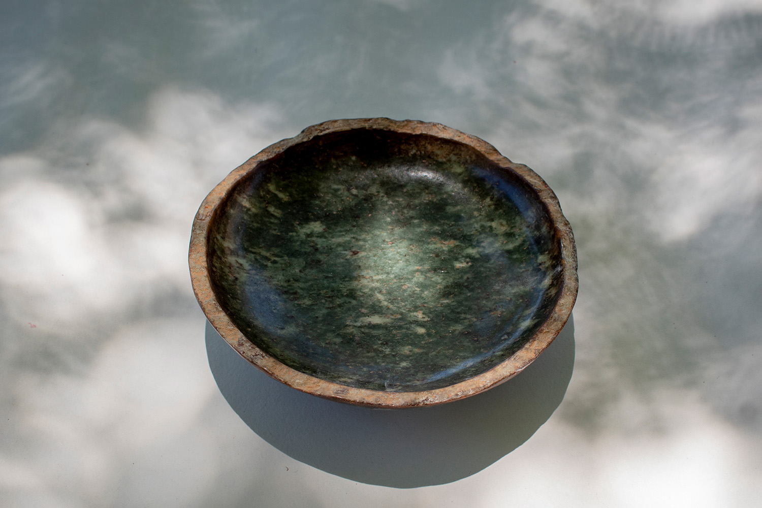 This small circular bowl is hand carved from natural opal stone. The bowl is polished, and the edge is left raw for contrast. The stone is a mottled green colour, giving the bowl a marbled appearance.
