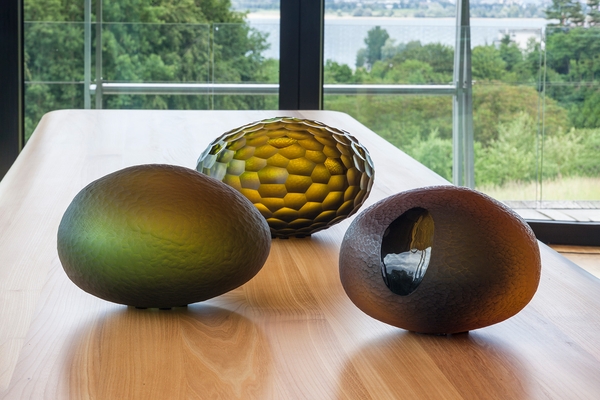 Using ancient Muranese techniques zanfirico and a canna, Eva Moosbrugger made these three multicoloured and nature-inspired sculptures with free blowing and hot shaping. Copperwheel engravings, a piatti, and her own 'haptoglyph' technique are used to structure the surface.