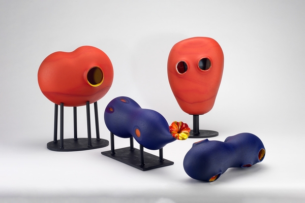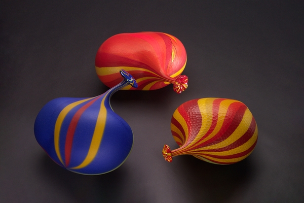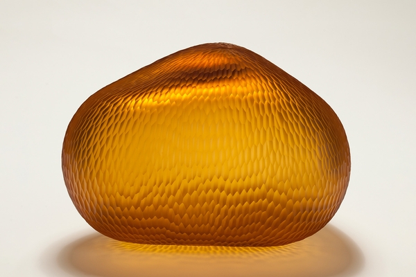 Loaves are free blown and hot shaped into very large, heavy sculptures. The transparent, amber-hued glass represents the sun's light, which makes the grain ripen for our daily bread. They are engraved by a stone wheel and polished by hand.
