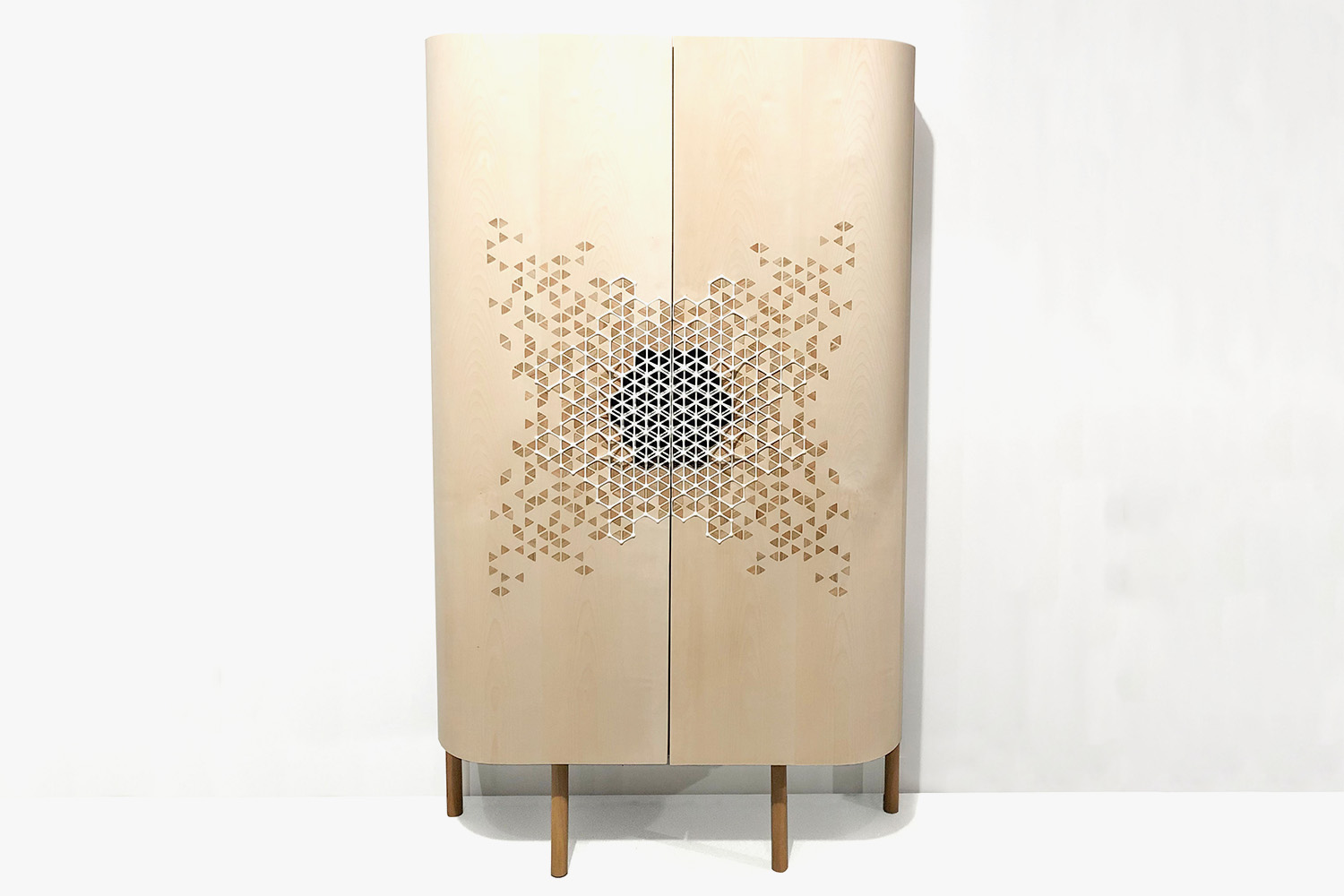 This wardrobe is a one-of-a-kind custom piece. It has a walnut interior and sycamore exterior with marquetry work of different materials: nylon and different types of wood. The nylon also serves as a handle. The doors are rounded at the two ends.