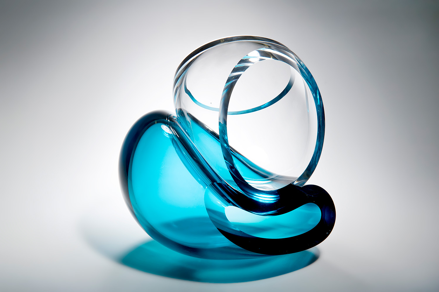 This is a free blown glass, copper blue sculpture with highly polished cut surfaces.