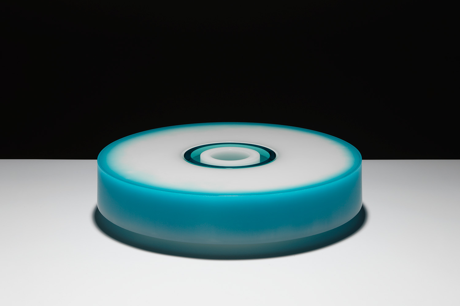This is a circular, horizontal sculpture in white and aqua tint glass with aqua tint and white glass inserts. The glass is cast in lost-wax, ground, polished, and assembled.