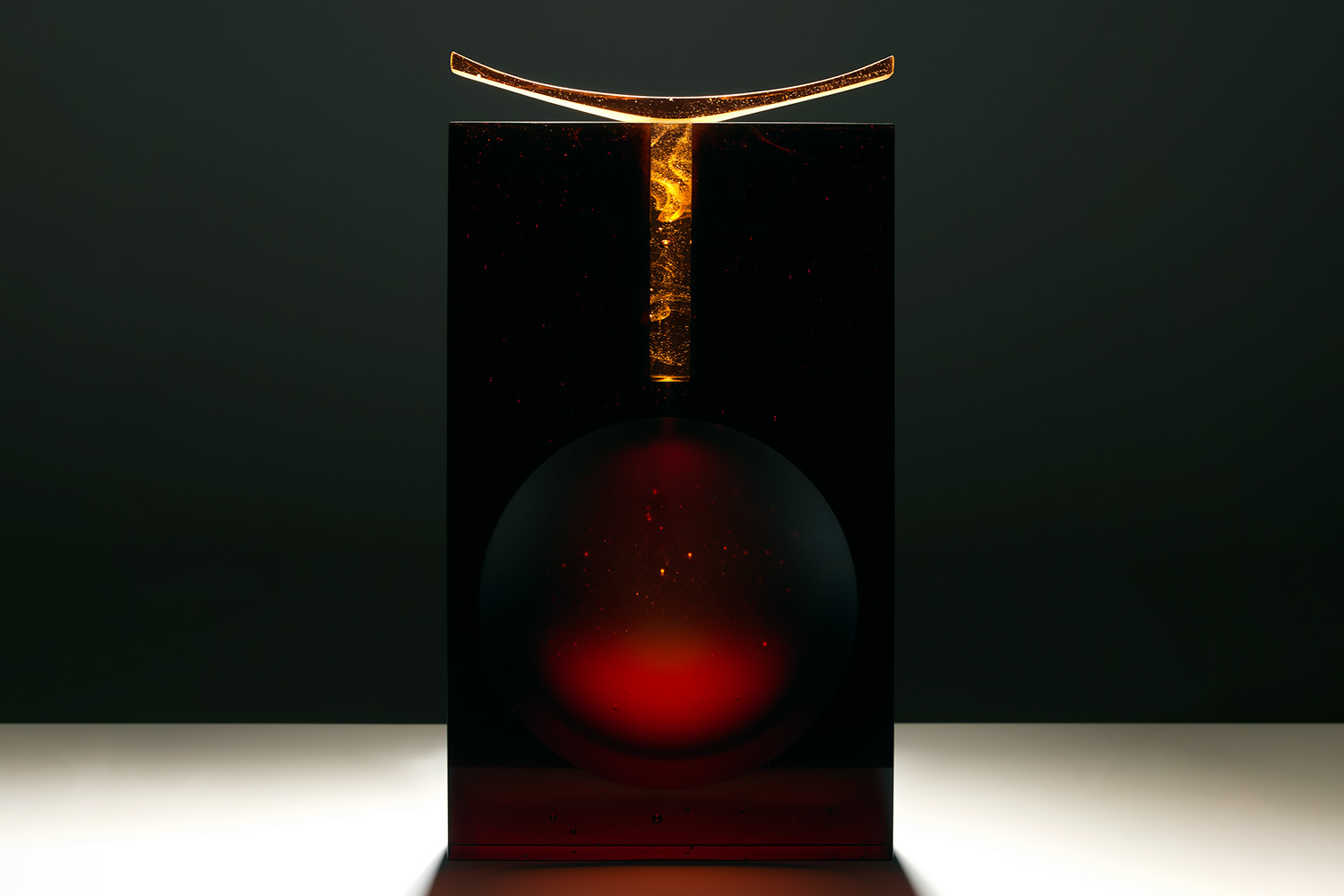 This is a vertical, rectangular sculpture in red amber glass with a yellow glass insert and top. It is cast from lost-wax, ground, polished, and assembled.