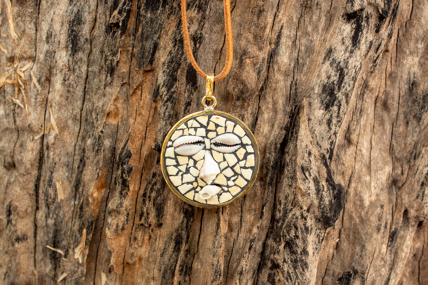 This pendant is formed using a repurposed brass tubing base, inlaid with mosaic ostrich egg chips and small cowrie shells. The base is created by cutting fine slices of plumbing tubing, which is then soldered to a hand-cut, brass sheet back plate. The micro mosaic design is inspired by a Makishi mask face and is set with black jeweller’s grout, and given a high-sheen polish. Makishi is part of a traditional rite of passage ceremony for boys ushering them into manhood, and involves masked masqueraded dancers.