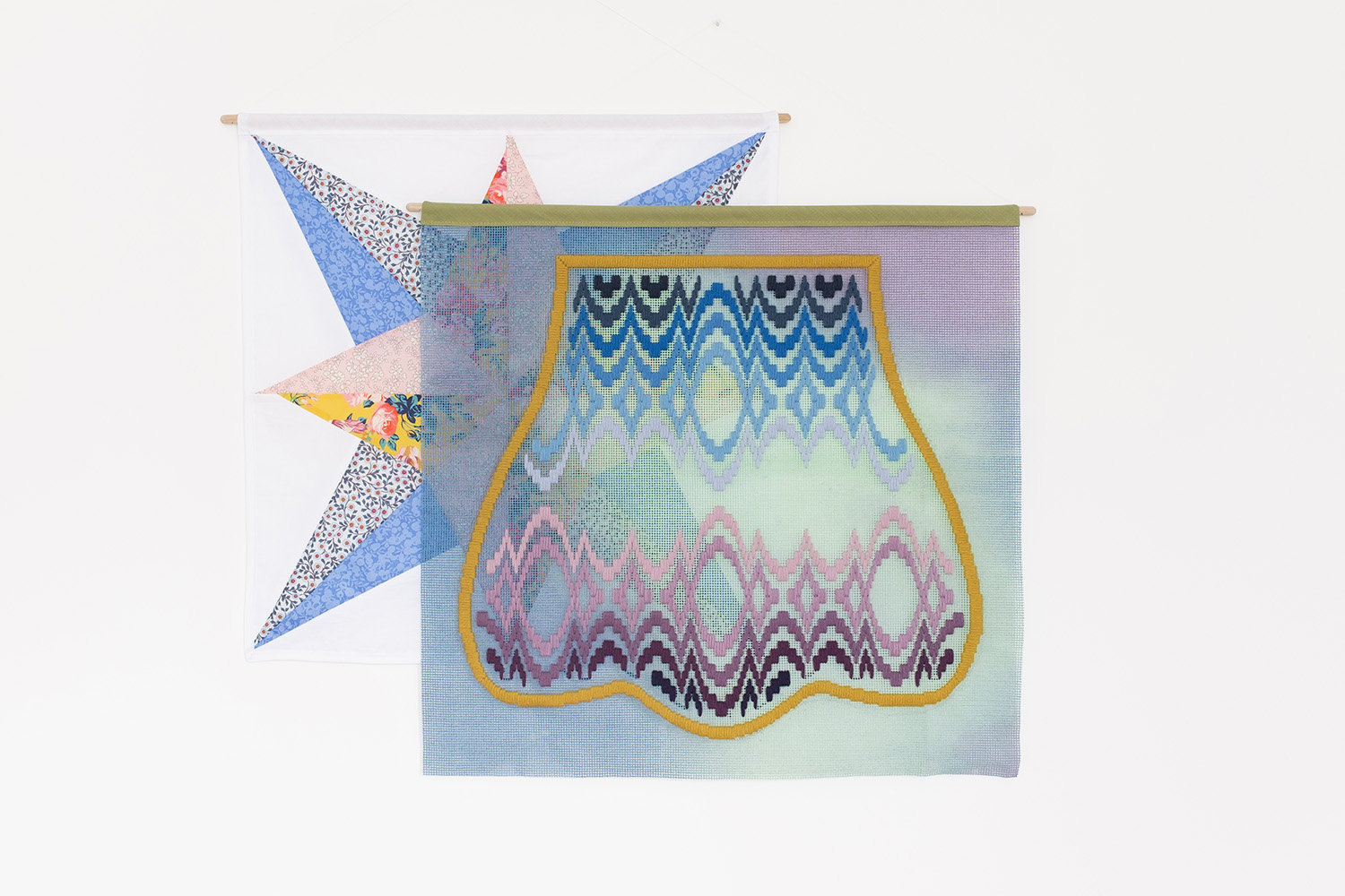 This 2-D loose wall hanging is made of blue and purple Bargello embroidery on a blue, green and purple woven background.