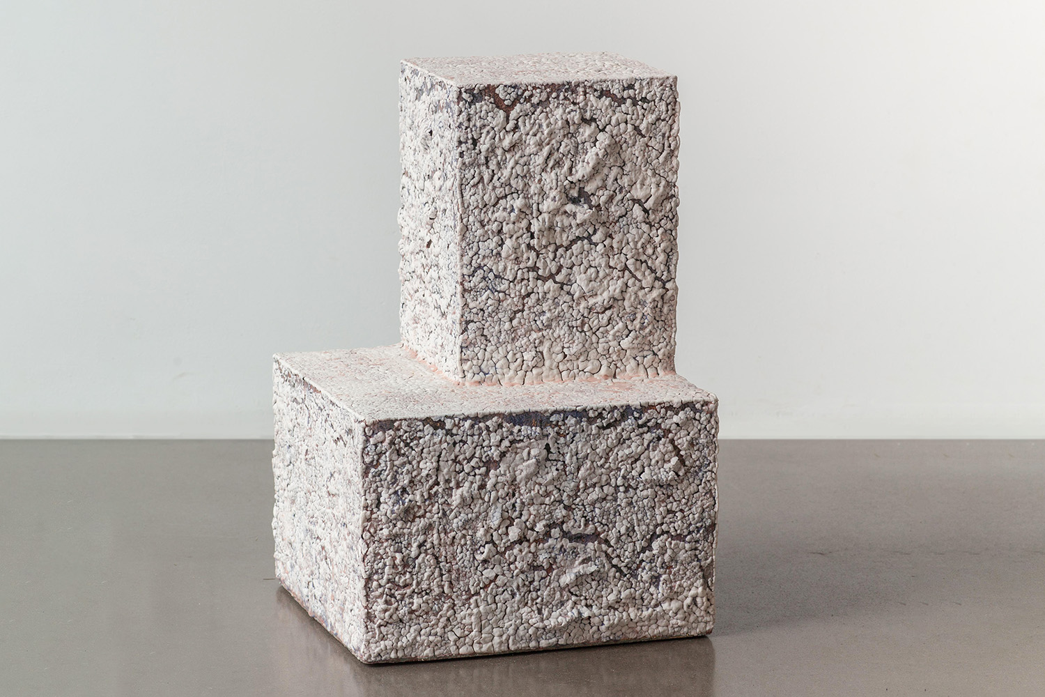 In this sculpture of a smaller block on top of a bigger one, white is the dominant colour. Peeling layers of the surface represent the ageing of architecture. By allowing materials to act on their own during the firing, Irina Razumovskaya acts as co-creator, together with nature and heat.