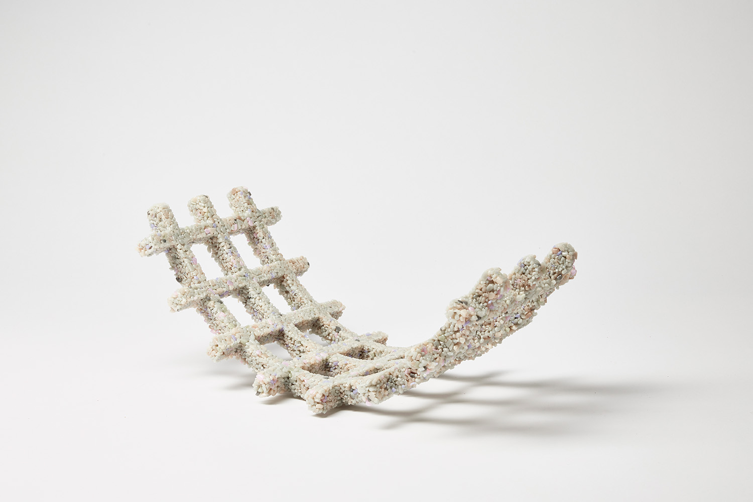 Here is a sculpture made from two kiln-glass processes. Firstly, coarse grains of gravel-like glass are fused within a mould to produce the grid shape, which is so prosaic within our urban environments. In a second firing, the glass grid is bent by subjecting the glass to heat and gravity. An aggregate of soft neutral tones with hints of pink and green has been used here, which is suggestive of architectural materials such as granite and concrete.