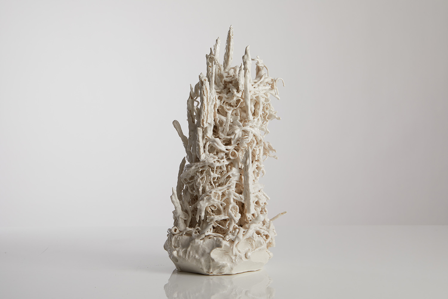This is a ceramic sculpture made up of handmade fragments. They have been modelled, dipped, slipped, cast, thrown, cut up, pressed and extruded. There is a mixture of long shards and denser pieces. The work is finished with a transparent glaze.