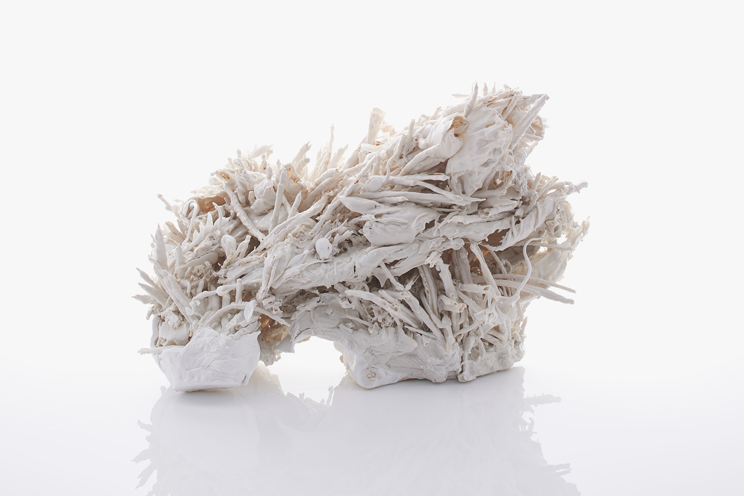This is a large porcelain sculpture made of multiple elements which have been modelled, dipped, slipped, cast, thrown, cut up, pressed and extruded. The piece is finished with a transparent glaze displaying the pure porcelain beneath.