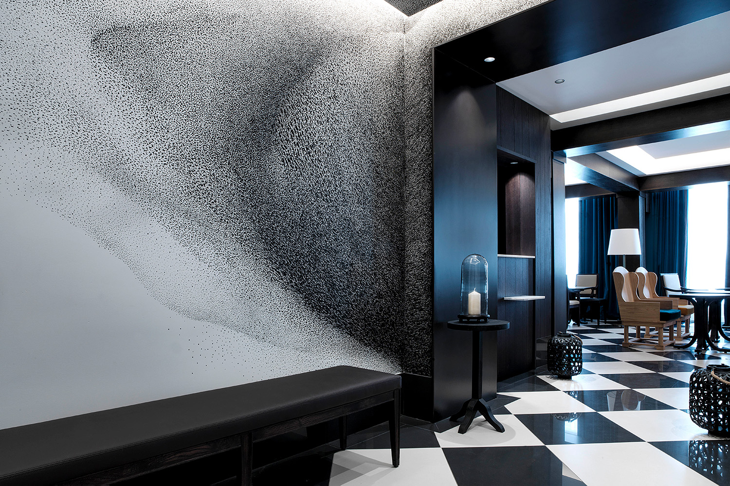 Alix Waline created this mural for the lobby of the Chess Hotel in Paris. The bespoke commission is composed of Alix's signature dots in collaboration with Gilles & Boissier. The decorative painter made the abstract pointillist drawing with black felt pens.