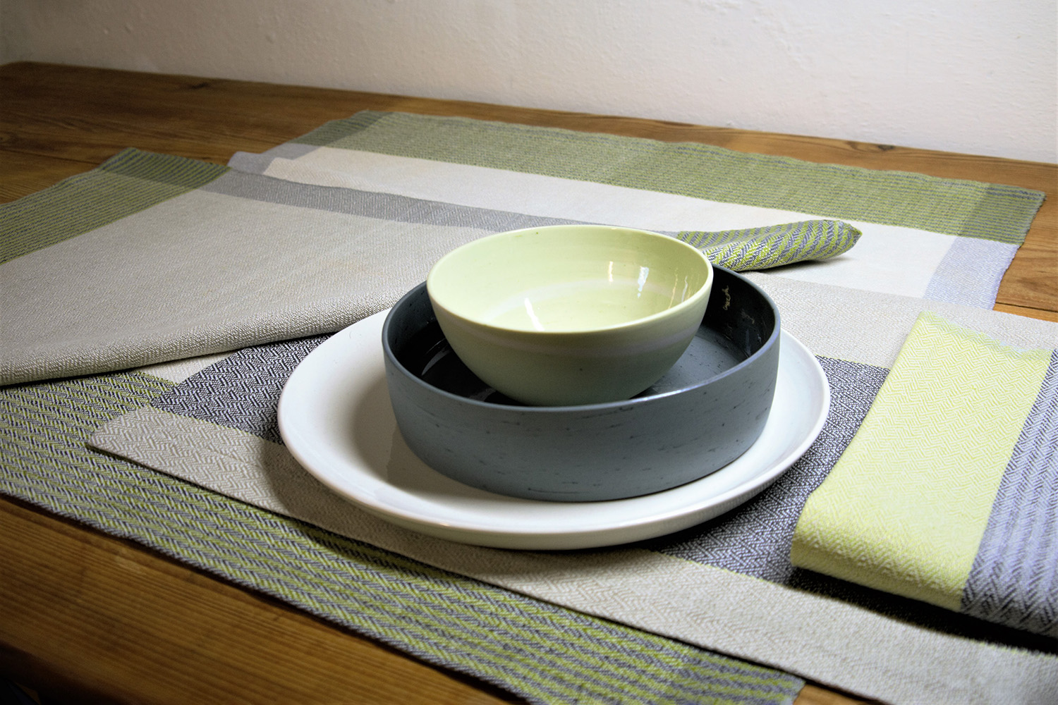 This set of table linen in various colour combinations using natural, grey, green, yellow and blue shades was handwoven using the cross-twill technique. The different pieces in the set are made from a linen and cotton 50-50 blend.