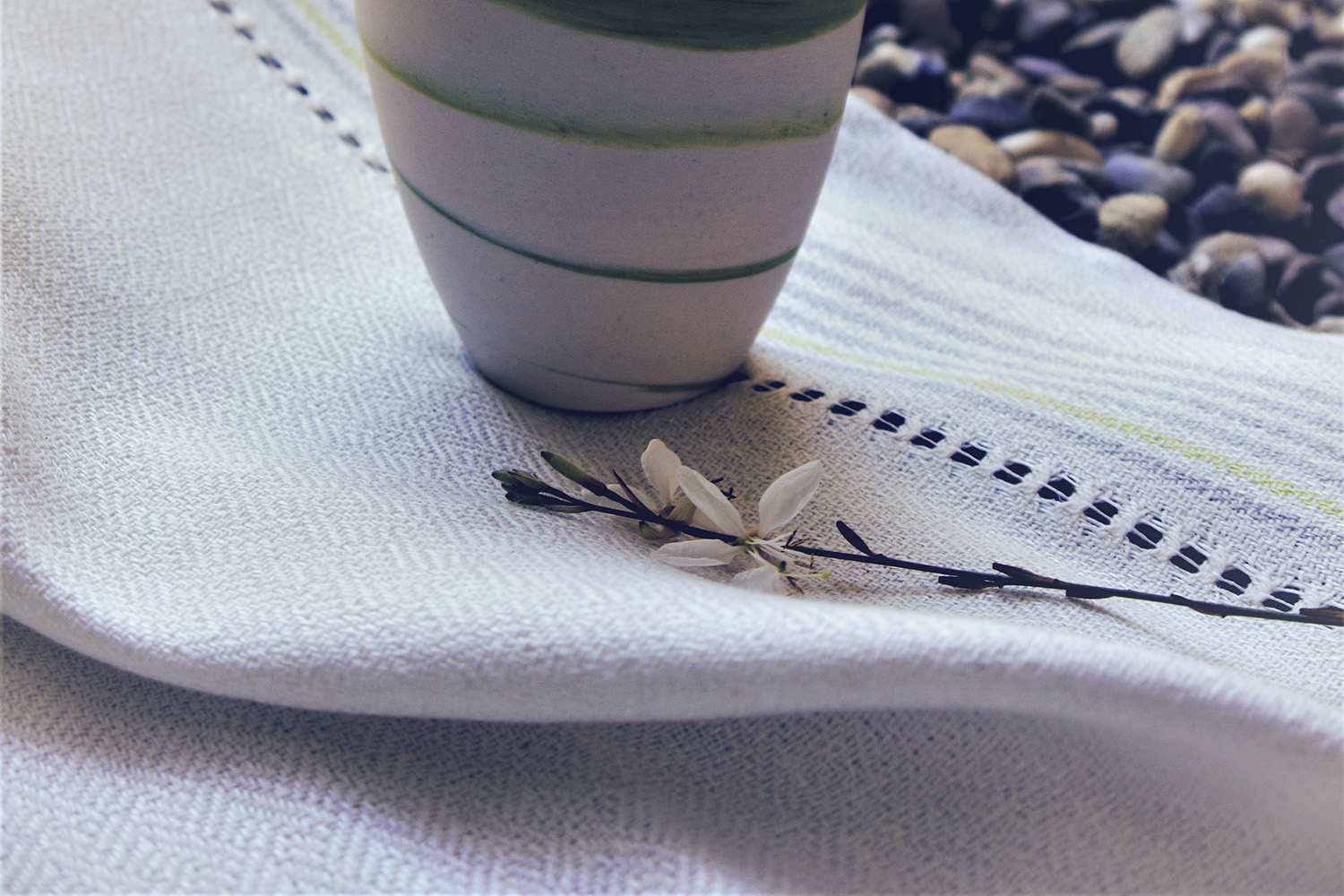 This fine napkin is inspired by spring and the delicate blossom of the sea thrift, which is pictured on the napkin as well. Stripes in yellow and blue tones give a special touch to the cross-twill base weaving. Michaela-Stefanie Karle's favourite cup by Kathrin Ritzi-Schaufelberger is on top of the napkin.