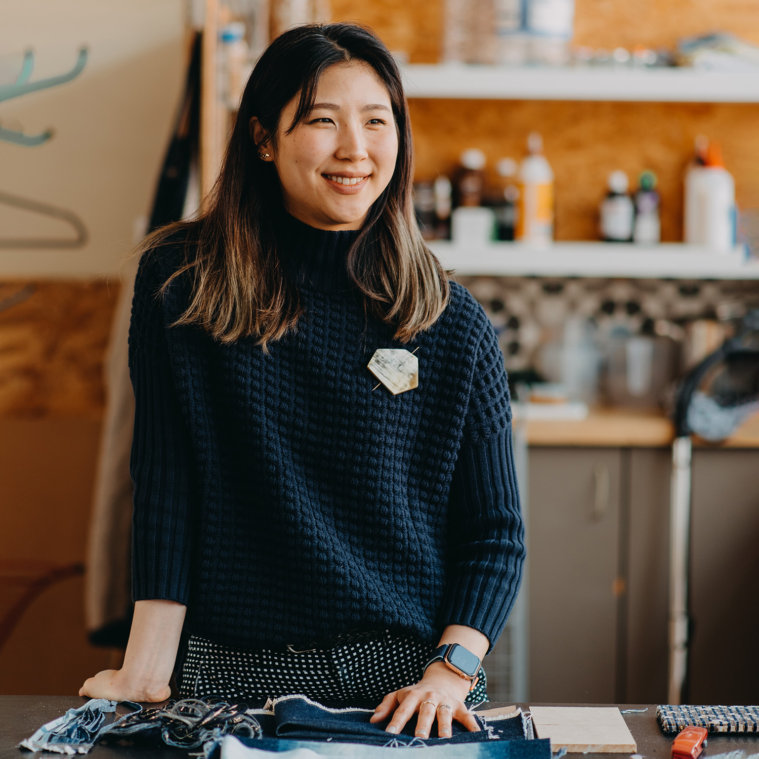 This is the first jacket made by Momoka Gomi with the so-called Decay fabric, a hand-woven denim whose surface is aged by time and decorated with shining gold foil symbolising repair and mending. The jacket is part of a wearable craft project, based on Momoka's interest in the relationship between body and textile and the function of fabrics in our society.