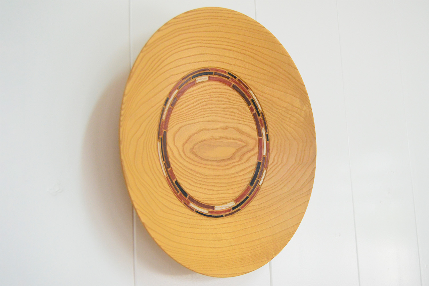 This is a turned plate of 35 cm diameter, decorated with coloured pencil which was then fixed with polyurethane.