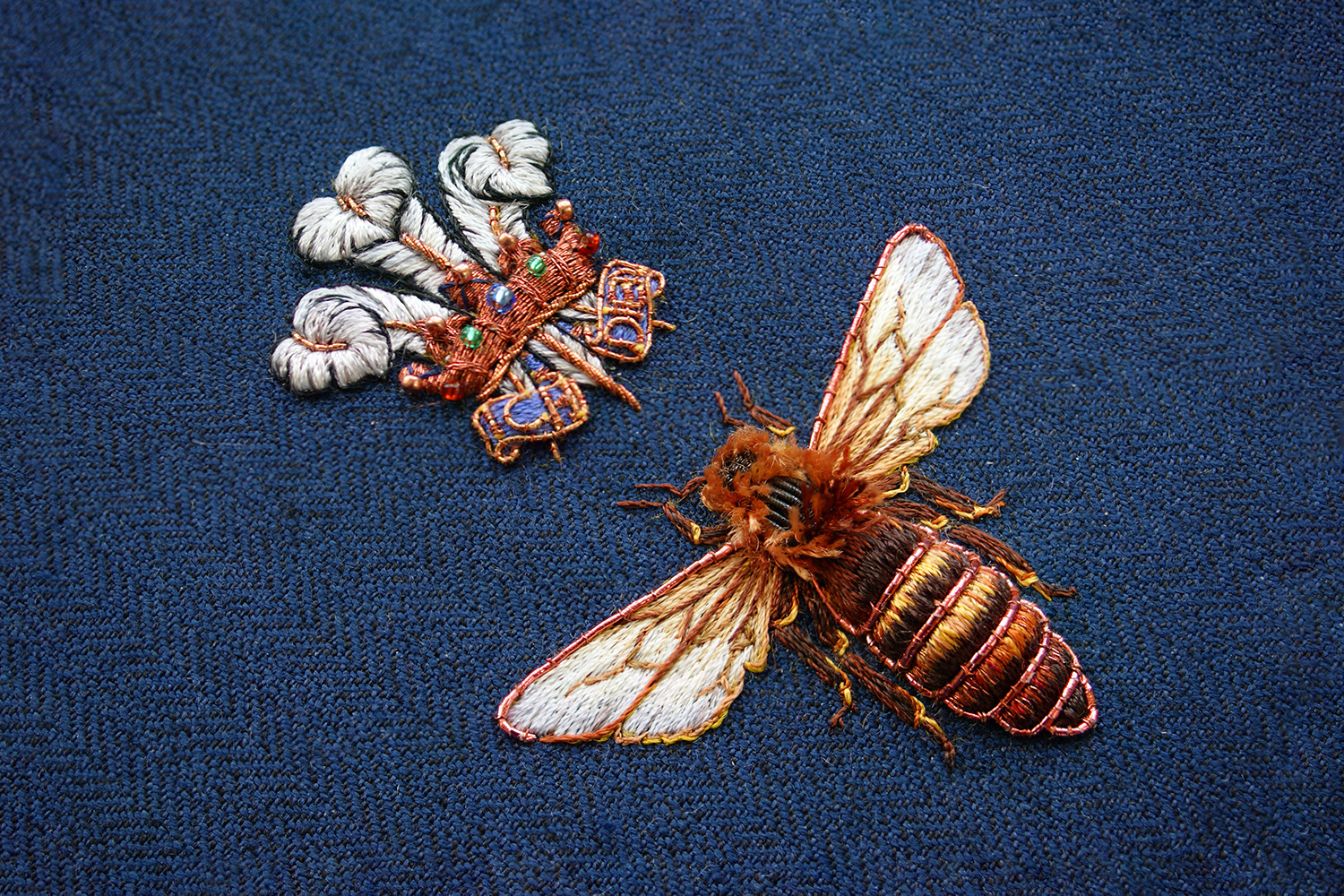 This is a queen honey bee with The Prince of Wales’ feathers. It is a framed artwork created in hand embroidery with precious metals, silk shading and raised-work for a three-dimensional finish. The artwork is held in the Royal Collection.